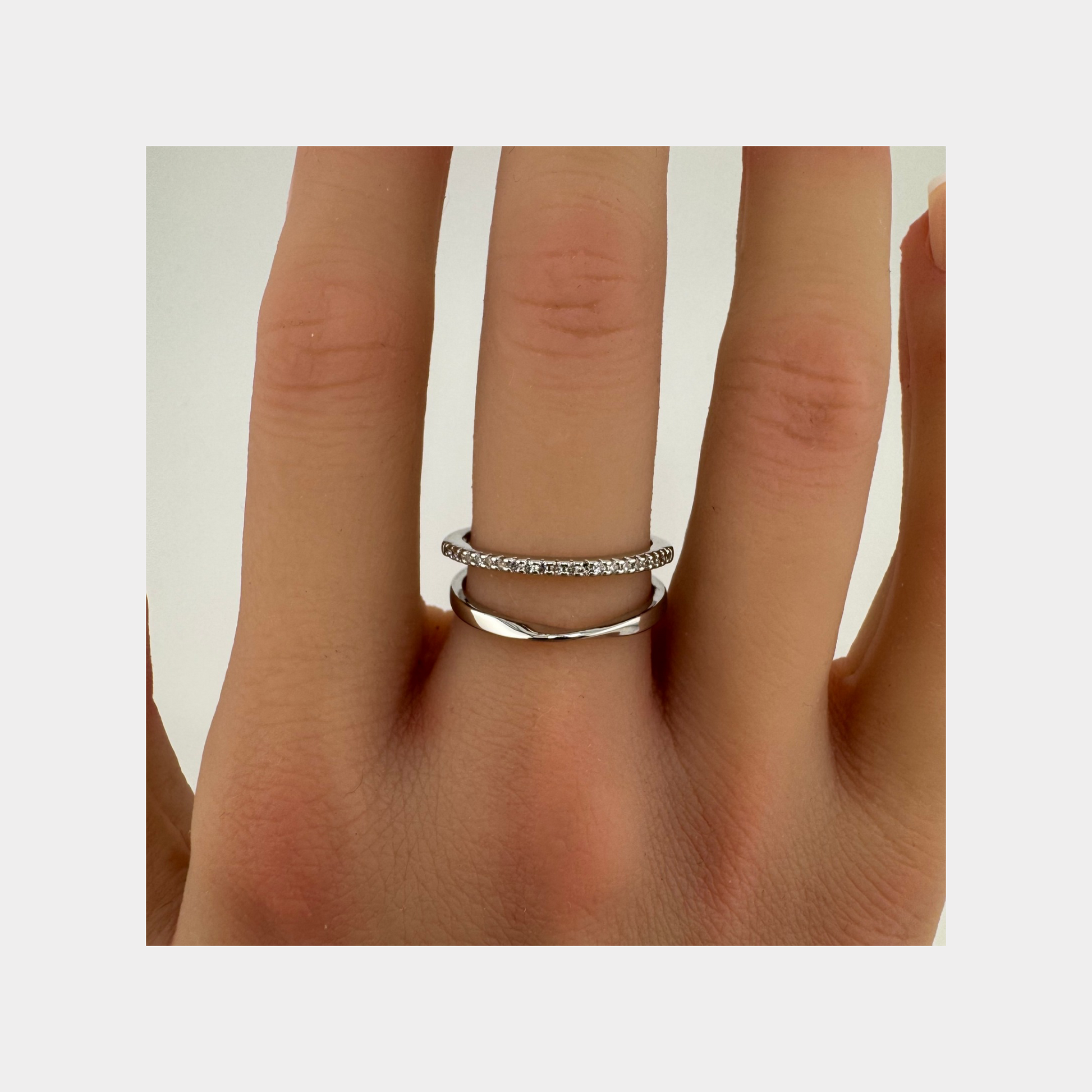 This minimalist sterling silver double layer ring with sparkling zircon gemstones is not just a fashion statement, but also a perfect gift for yourself or a loved one. Its unique design adds a touch of elegance to any outfit. Treat yourself to this delightful accessory.