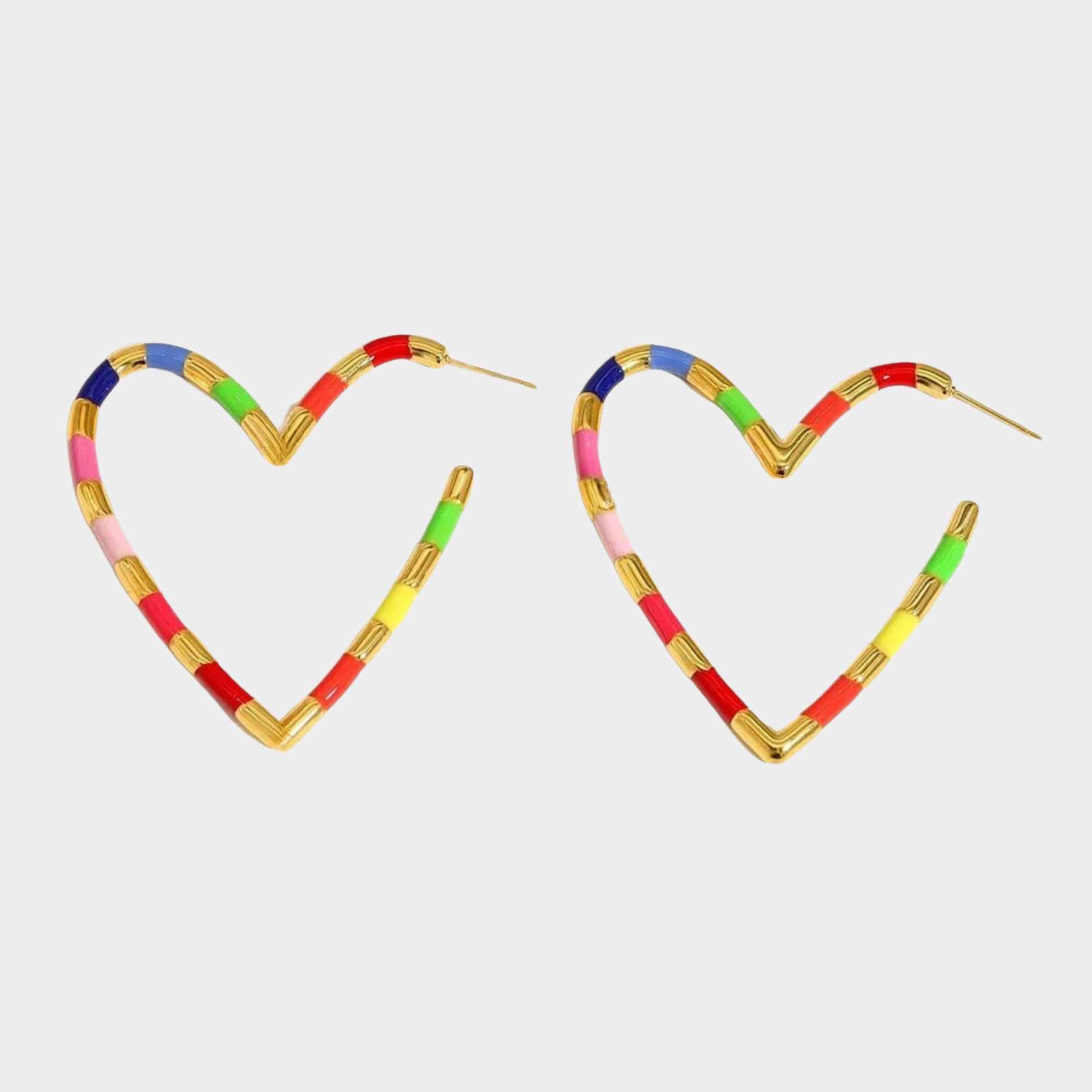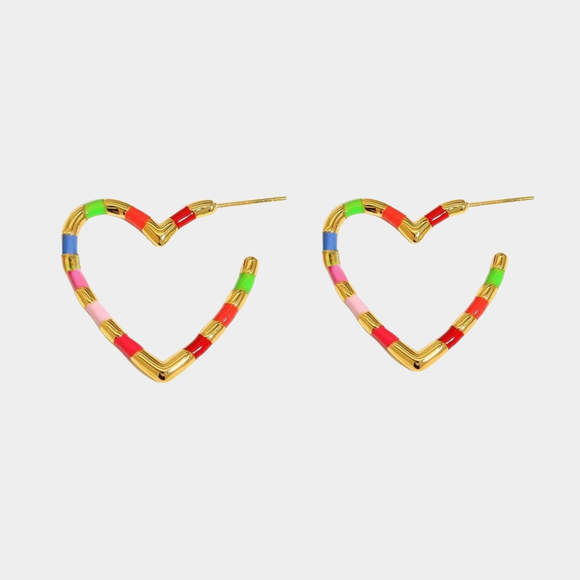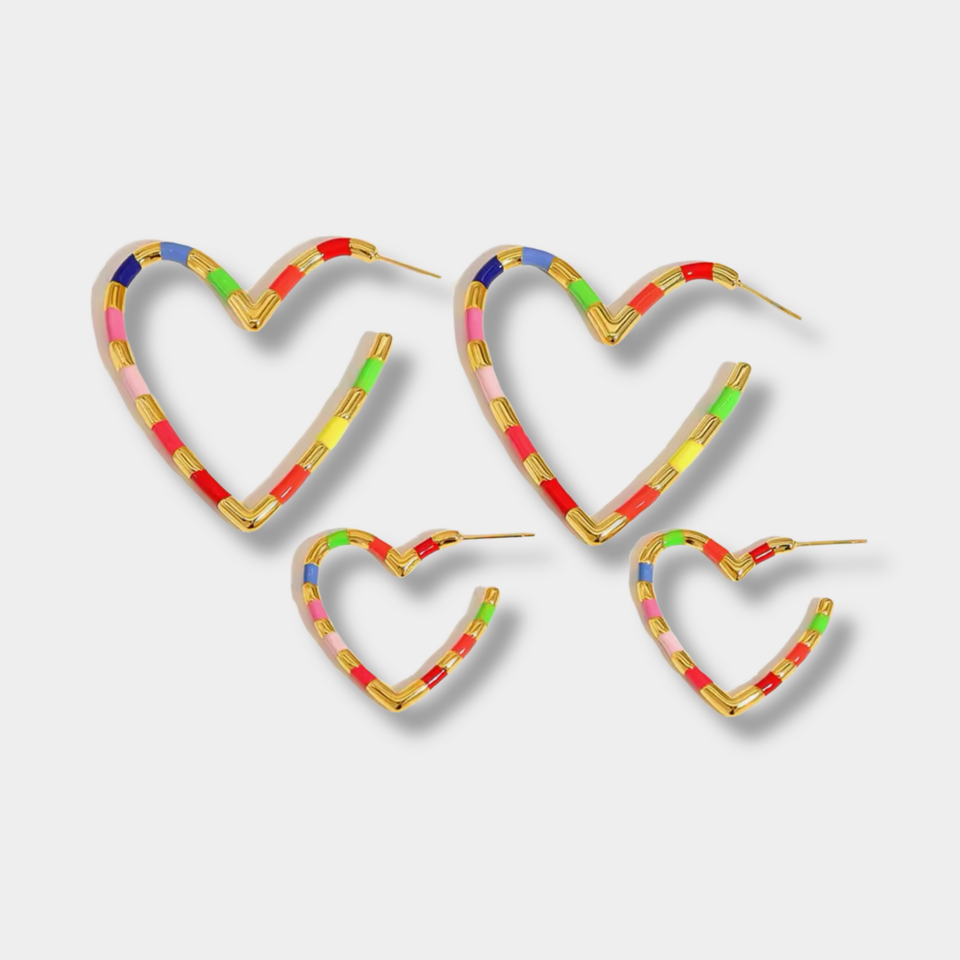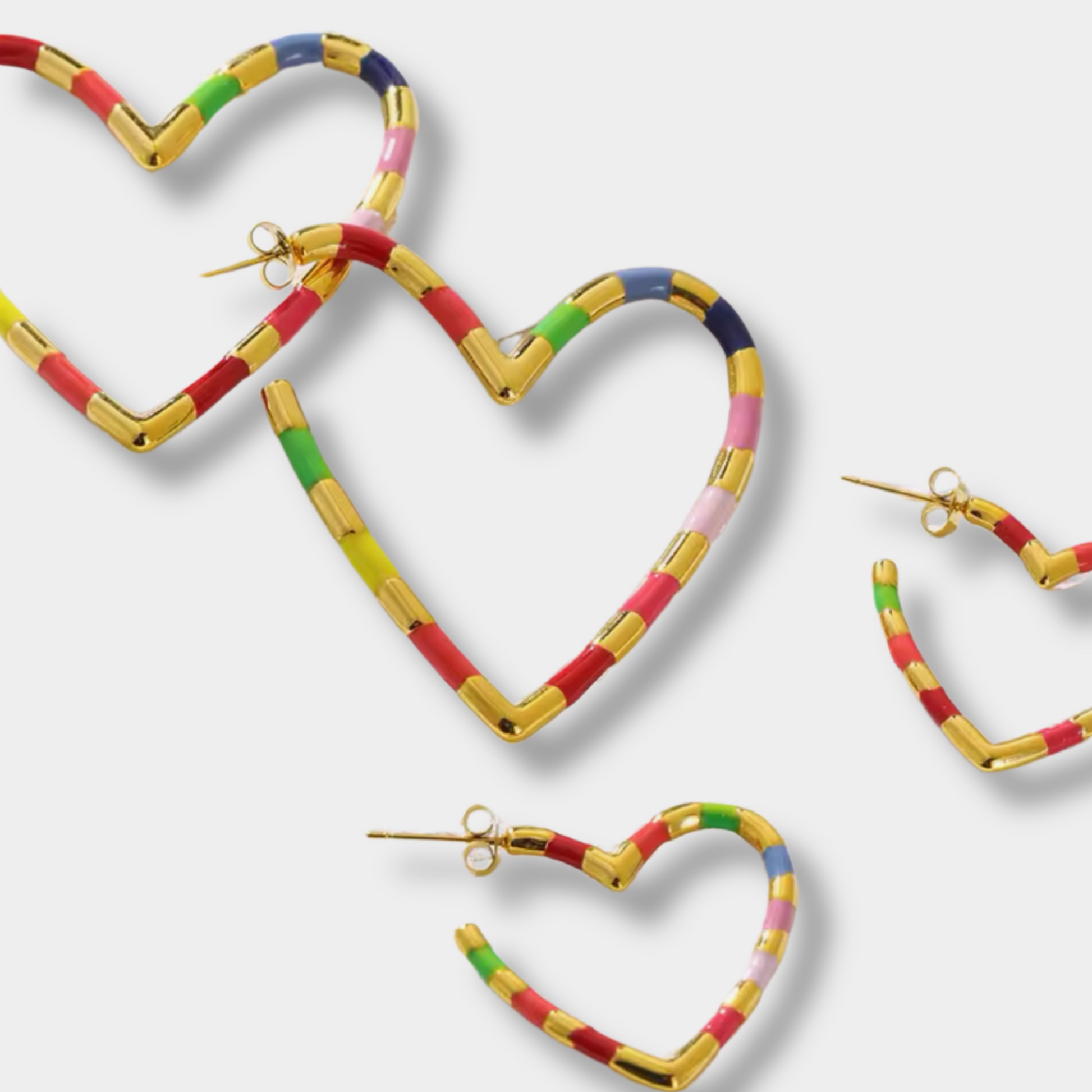 These 18-karat gold plated colourful heart hoop earrings are incredibly versatile and can be worn on a variety of occasions. Whether you're looking for something to wear casually or on a night out, these earrings will elevate your outfit and style.