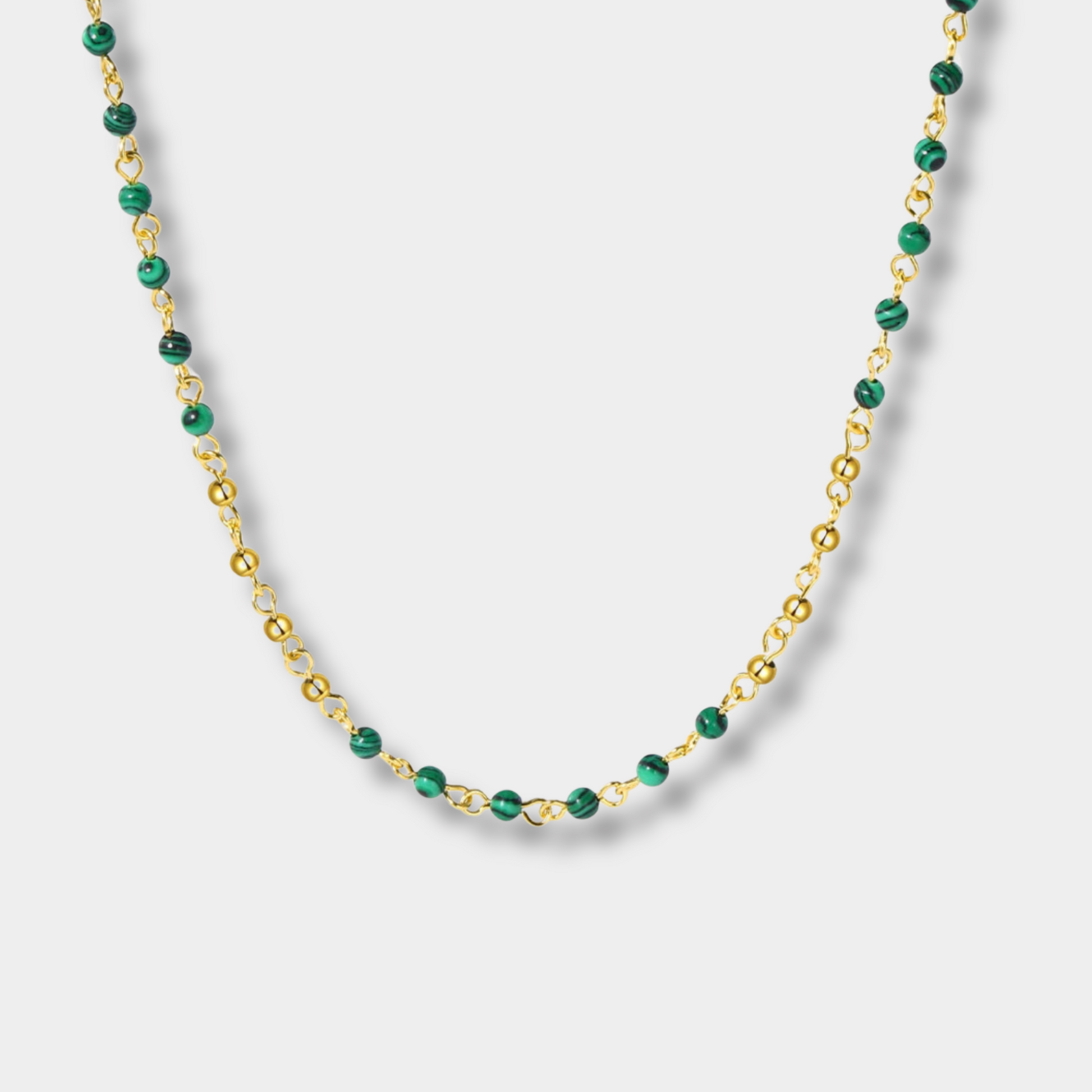 This 18-karat gold plated green beaded necklace is incredibly versatile and can be worn on a variety of occasions. Whether you're looking for something to wear casually or on a night out, this necklace will elevate your outfit and style.