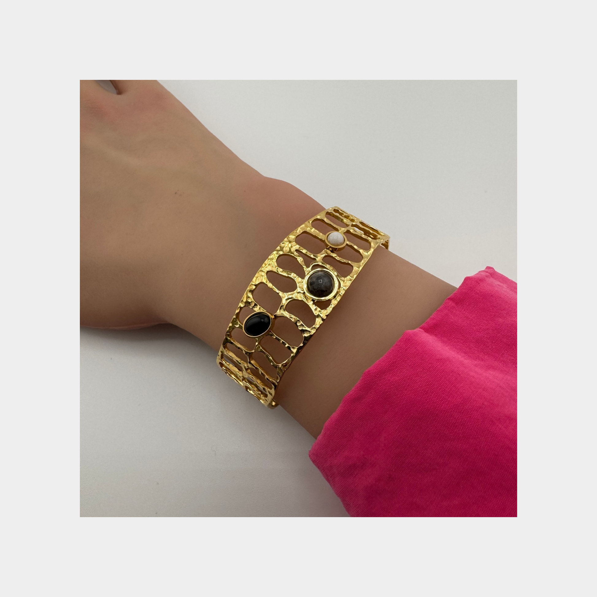 This 18-karat gold plated hollow pattern bangle is incredibly versatile and can be worn on a variety of occasions. Whether you're looking for something to wear casually or on a night out, this bangle will elevate your outfit and style.