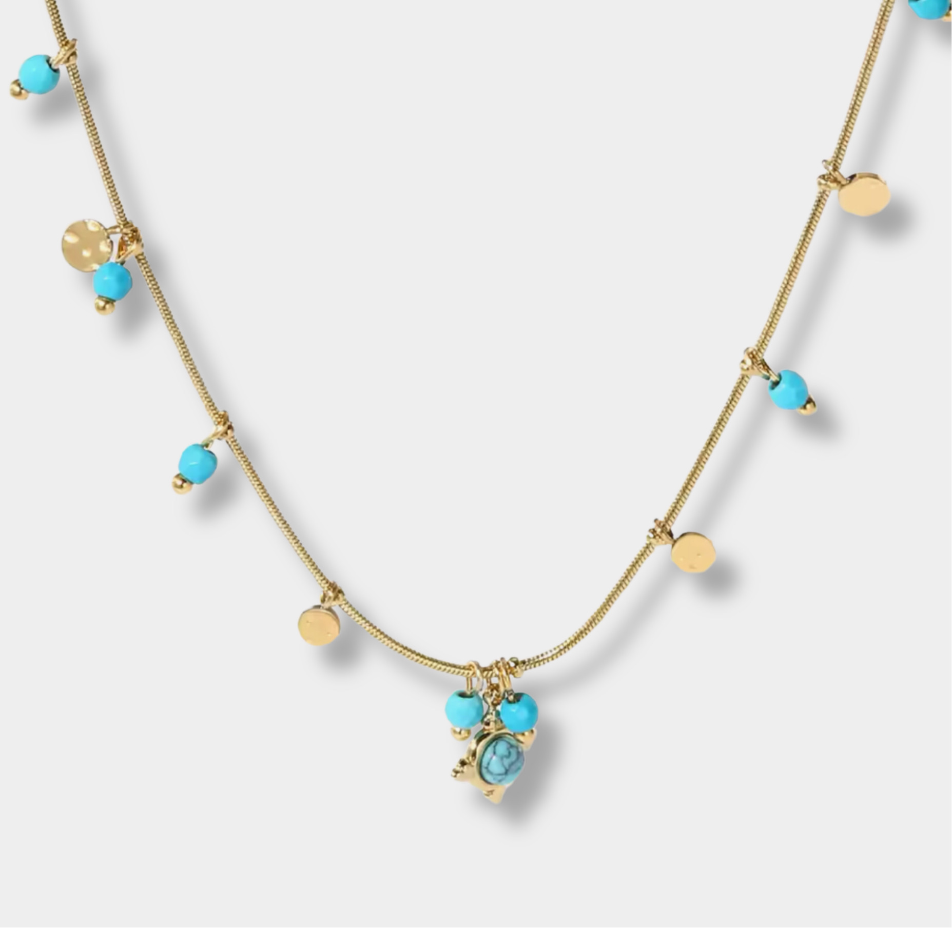This 18-karat gold plated turquoise beaded necklace is incredibly versatile and can be worn on a variety of occasions. Whether you're looking for something to wear casually or on a night out, this necklace will elevate your outfit and style.