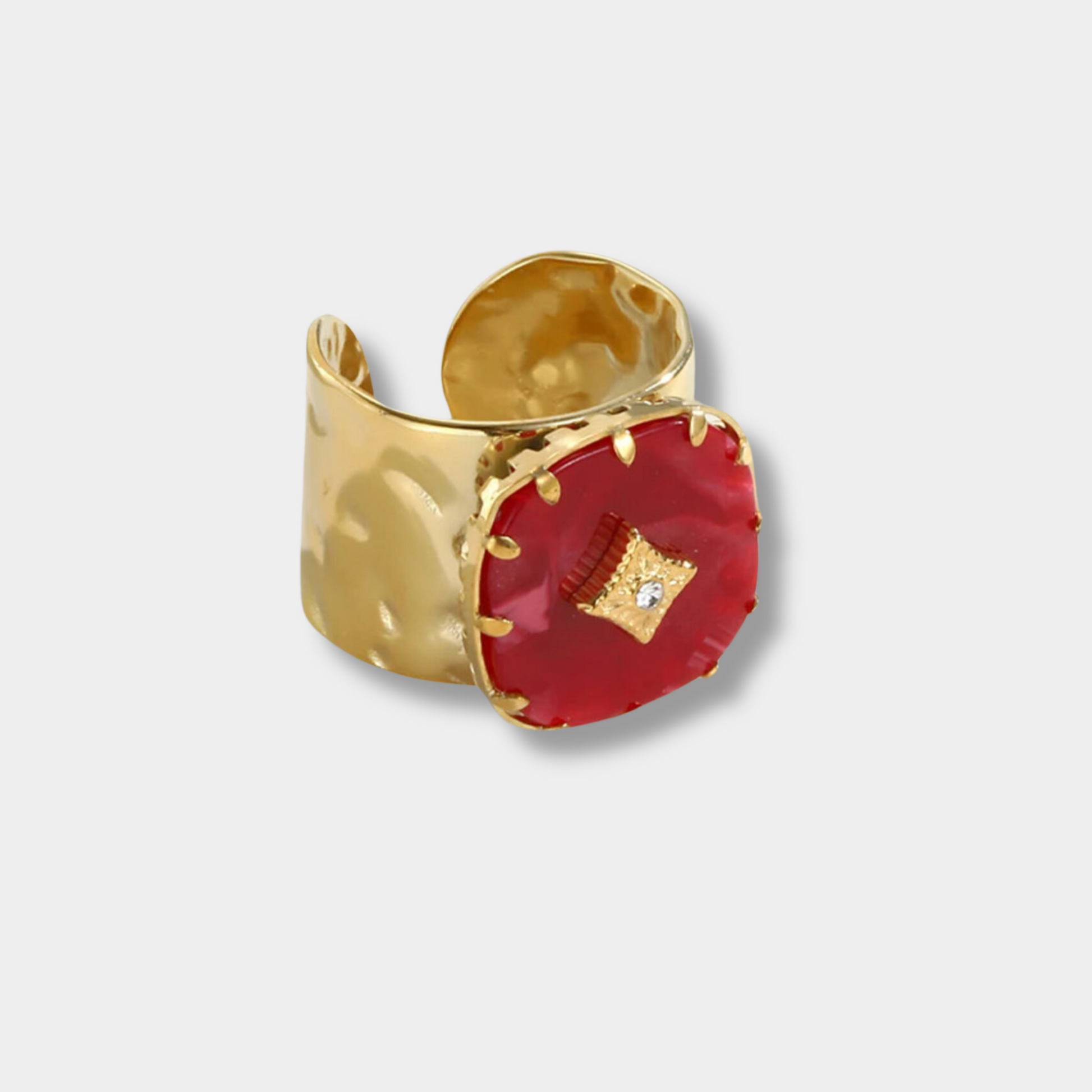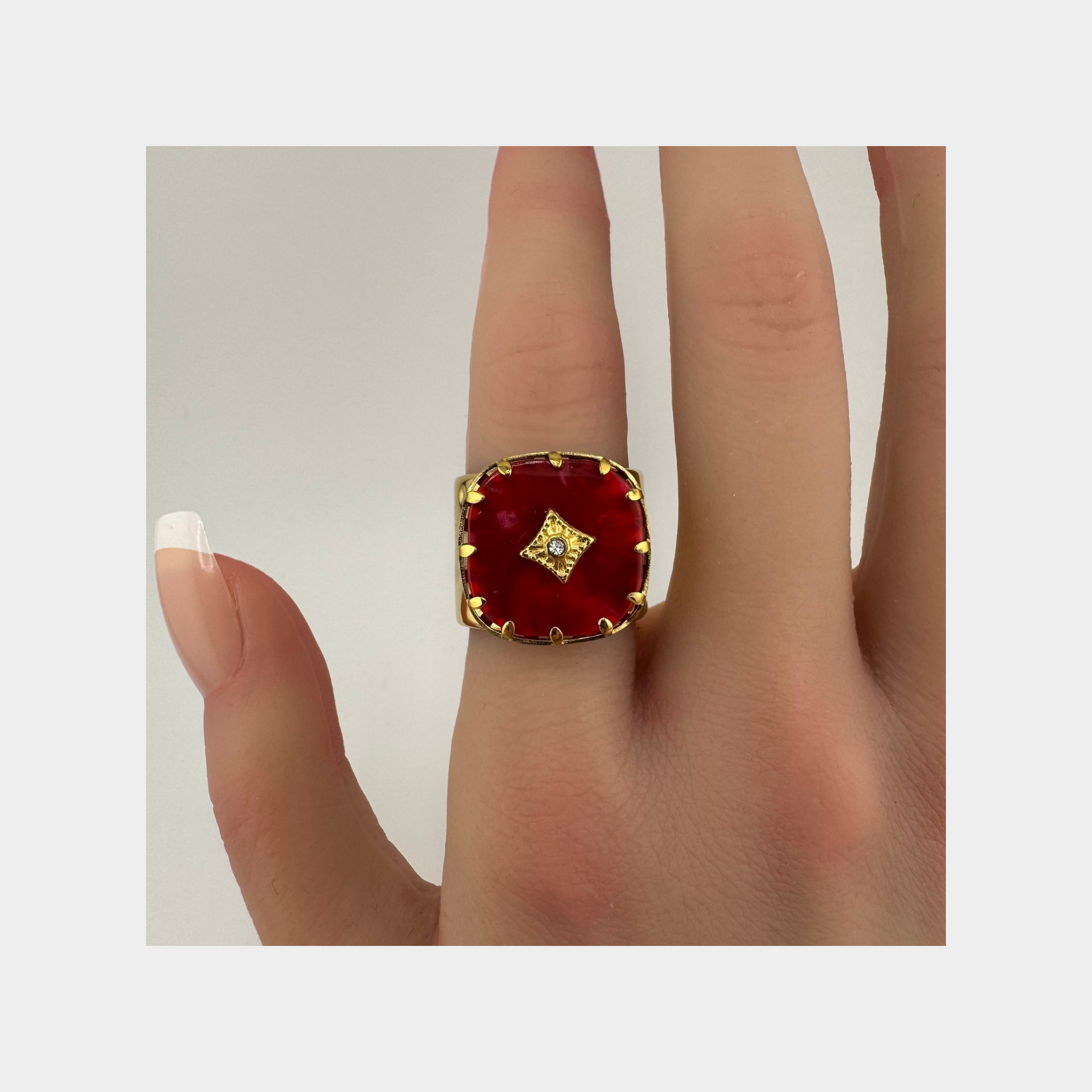 This 18-karat gold plated red cushion shaped ring is incredibly versatile and can be worn on a variety of occasions. Whether you're looking for something to wear casually or on a night out, this ring will elevate your style.