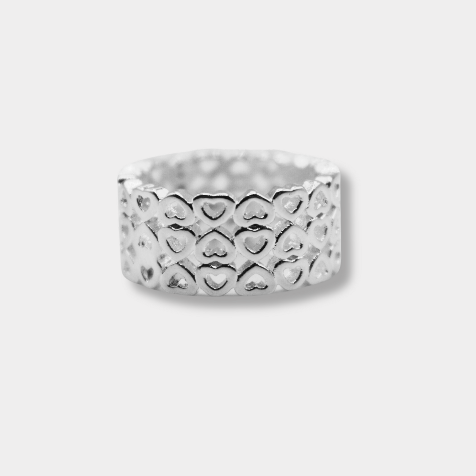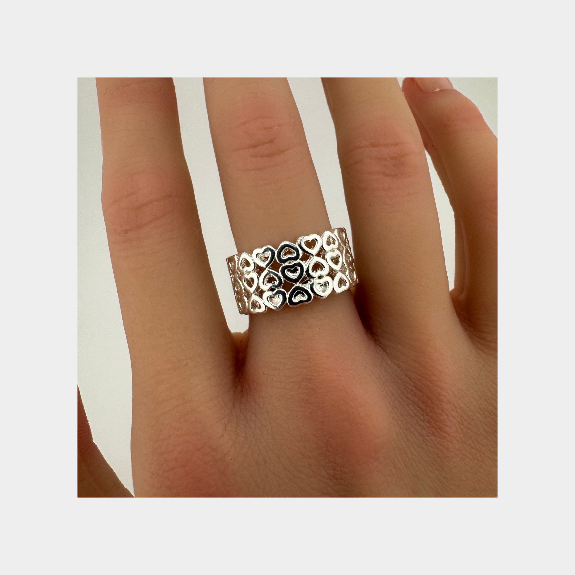 This stunning multi-heart ring is a timeless piece that makes a bold fashion statement. Its sleek sterling silver band showcases striking hearts, making it a versatile accessory for any occasion. With its elegant design, this ring is the perfect gift for yourself or a loved one. Incorporate this trendy accessory into your wardrobe for a touch of style.